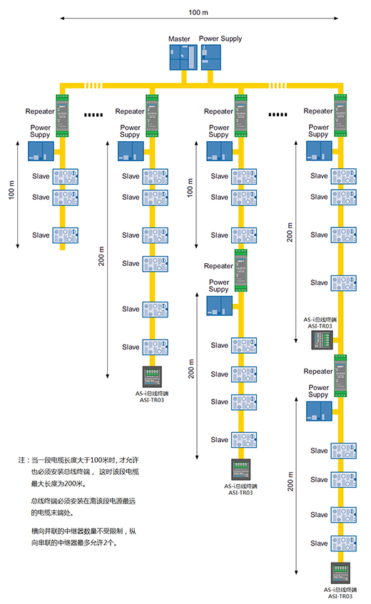 AS-Interface repeater. Extend the AS-i bus communication distance by 100m; Opto-coupler isolation; Maximum isolation voltage: 1500Vrms (can be customized with maximum isolation voltage of 5000Vrms and in line with mine safety regulations); Support AS-Interface Spec.V3.0 and both upward and downward compatible; AS-i voltage range: DC 29.5-31.6V; Current consumption: <30mA; Support point-to-point, bus and star connection topologies; Plug-and-play without settings; Protection grade: IP20; DIN35 standard lead rail mounting.