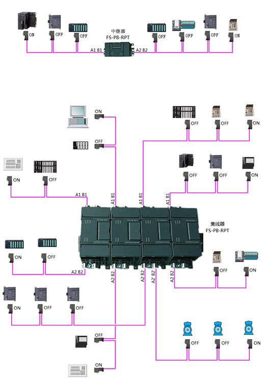 Extensible PROFIBUS/MPI/PPI repeater hub. A single device can be used as a repeater, and multiple devices (N pcs) can form a 2N-port hub; Communication rate: 0-1.5Mbps (or 0-12Mbps), self-adaptive; Support redundant power supply; Realize PROFIBUS/MPI/PPI bus, star and hybrid network topologies to facilitate network cabling; Transparent data transmission without delay; Bi-directional extended communication distance in line with the PROFIBUS standard; With communication indicator; 9-40VDC wide voltage isolated power supply; Power supply-RS485-RS485 completely isolated; Lightning and surge protection; Interface: terminal block in accordance with the PROFIBUS standard; Standard lead rail mounting.