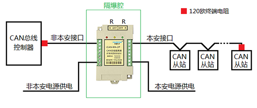 CAN bus isolator. Isolate the CAN interface or CAN bus to suppress interference and protect the interface; In line with the design specifications for intrinsic safety in mines; Suitable for connecting the CAN interface of mine intrinsically safe equipment to the CAN interface of non-intrinsically safe equipment; Isolation voltage: up to 7000VDC or 5000VAC; Baud rate: 0-5Mbps, self-adaptive; Extremely low transmission delay; Support all CAN protocols; The two CAN interfaces are powered by an external 5VDC intrinsically safe power supply respectively.