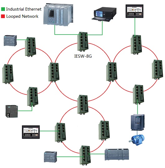 8-port kilomega looped network industrial Ethernet switch. In line with IEEE802.3 and 10/100/1000 Base-TX industrial Ethernet standard; Network interface rate: 1000M/100M/10M, self-adaptive; Support redundant topologies; Broadcast storm suppression function; With power supply and Ethernet interface status indicators; Each network interface isolated from each other and network interface isolated from the power interface; Industrial-grade standard design; DIN35mm standard lead rail mounting or bolt mounting; -40-+85℃ wide working temperature; Widely used in PLC, HMI, VVVF, DCS and other industrial control equipment based on industrial Ethernet.