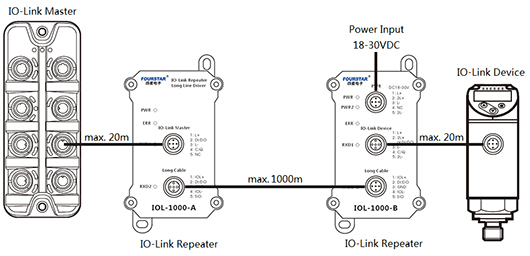 IO-Link repeater long-line transceiver. Extend the IO-Link communication distance to 1000m; Divided into two modules, A and B, which are used in pairs; Communication rate: COM1 (4.8Kbps), COM2 (38.4Kbps), COM3 (230.4Kbps), self-adaptive; Support IO-Link, SIO, DI/DO, Class A interface, Class B interface and other working modes; Plug-and-play without settings; 18V-30VDC wide voltage power supply; Protection grade: IP67.
