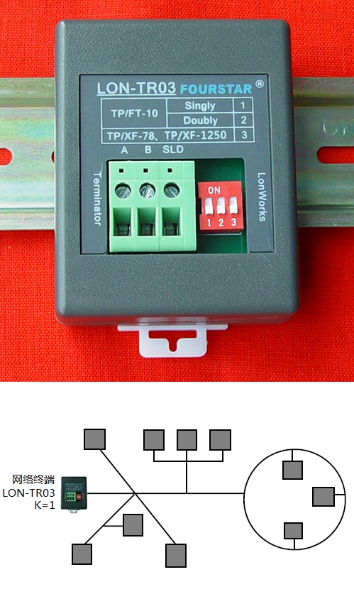 LonWorks universal network terminal matcher. In line with the LonMark standard; Applicable for TP/FT-10 (single-ended and dual-ended), TP/XF-78, TP/XF-1250 and other transceivers and topologies; Eliminate network signal reflections, reduce noise, increase network throughput, improve network reliability, reduce packet errors, and greatly improve LonWorks network performance; Require no power supply; Standard lead rail mounting.