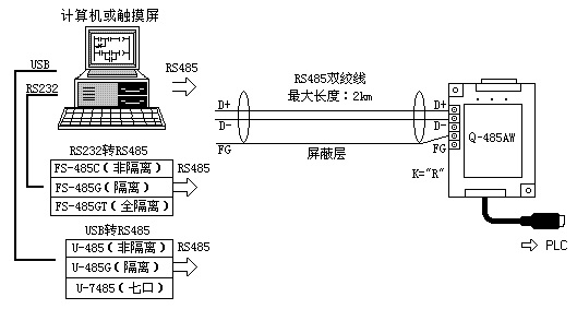 Mitsubishi Q series PLC programming interface to RS485 adapter. Convert Q series PLC programming interface (RS232) into RS485 signal for long-distance transmission; Maximum communication distance: up to 1200m; The interior adopts optoelectronic isolation anti-interference design and built-in lightning and surge protection circuit; Especially suitable for harsh industrial environments; Provide an isolated RS232 interface on Q-485AW to realize the short distance communication between PLC and host computer or touch screen.