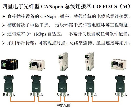 Optical fiber CANOpen bus connector (single-mode). 1-electriccal 2-optical; Single-fiber transmission; Direct plugged into the DB9 socket in line with the CANOpen signal arrangement standard; Achieve high-speed long-distance transmission of CAN/CANOpen/DeviceNet signals; Completely solve the engineering problems such as electromagnetic interference, ground loop interference and lightning damage in communication; With external 7-36VDC power terminals; Rate: 0-1Mbps, self-adaptive; Can form a bus, star and hybrid optical Fiber network; Convenient and flexible to use; ST optical fibre splice; Applicable optical fiber: single-mode 9/125, 10/125, 8.3/1; Optical fiber transmission distance: 0-10km; -40-+85℃ industrial grade working temperature.
