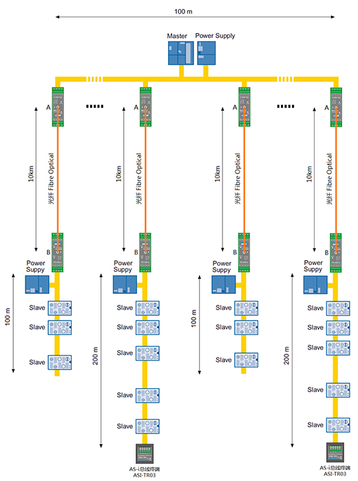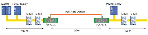AS-Interface to optical fiber adapter. Convert the AS-i cable transmission into optical fiber; Divided into two modules, A and B, which are used in pairs; Single-fiber transmission; Applicable optical fiber: single-mode 9/125, 10/125, 8.3/1; Maximum optical fiber transmission distance: 10km; Completely solve the interference problem; Support AS-Interface Spec. V3.0 and both upward and downward compatible; AS-i voltage range: DC 29.5-31.6V; Current consumption: <20mA; Support point-to-point, bus and star connection topologies; Plug-and-play without settings; Protection grade: IP20; DIN35 standard lead rail mounting.
